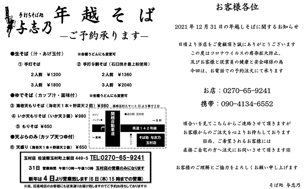 【年末年始の営業時間・年越しそばについてのお知らせ】